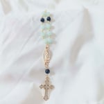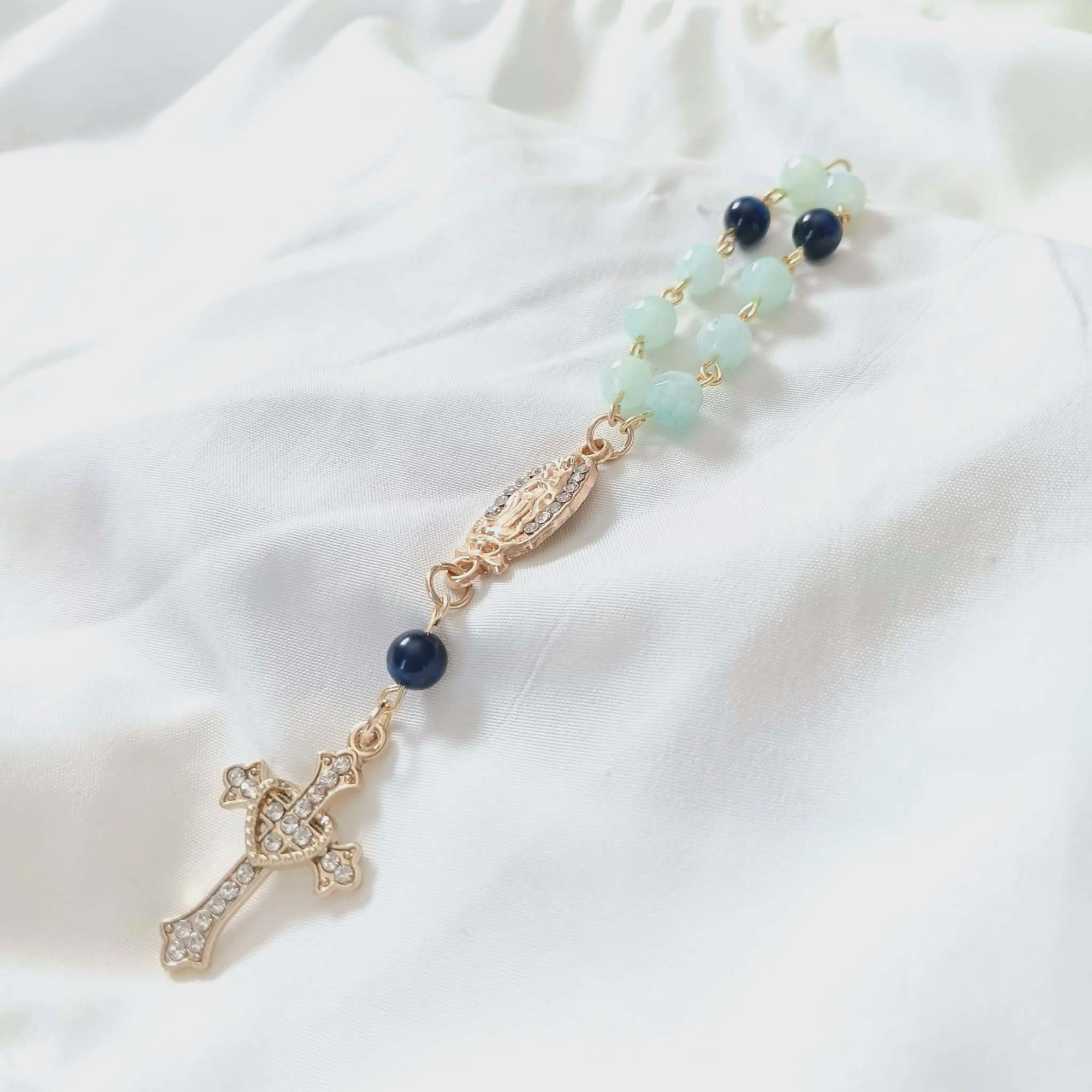 This rosary is made with glass beads in navy with a cat eye design, light blue glass beads a gold cross, and gold Mary medallion.